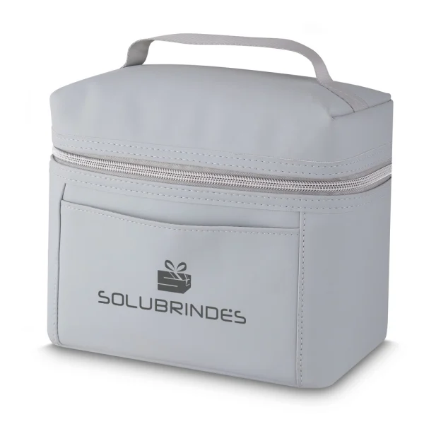 Bolsa térmica confeccionada em PU com capacidade de até 4 litros e fechamento em zíper. Possui revestimento interno térmico em que ajuda a manter a temperatura de alimentos e bebidas conservada por mais tempo. Apresenta bolso frontal e alça de mão para transporte.