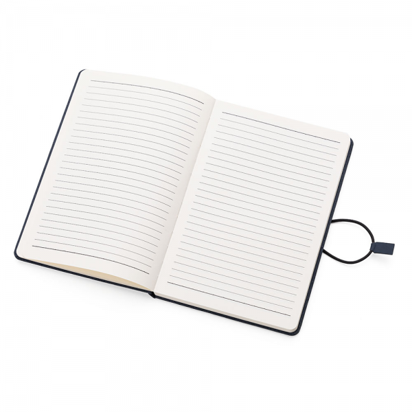 Caderno de anotações com elástico, capa dura em tecido poliéster, miolo 80 folhas pautadas na cor bege.