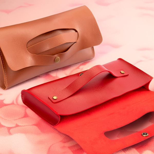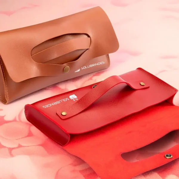 Carteira de mão com alça para transporte. Confeccionada em couro sintético, possui revestimento interno com textura aveludada e fechamento por botão de pressão.