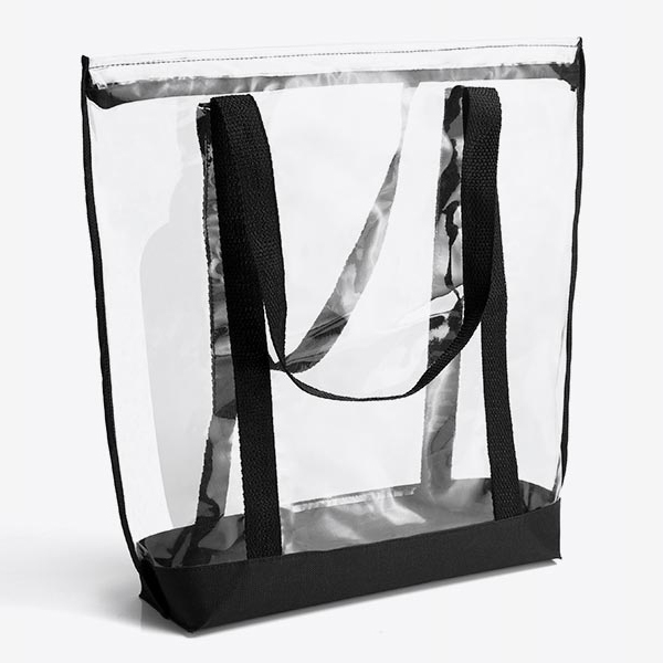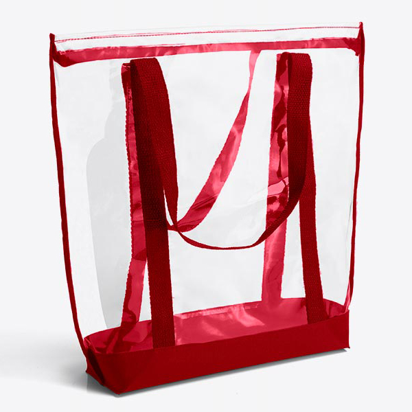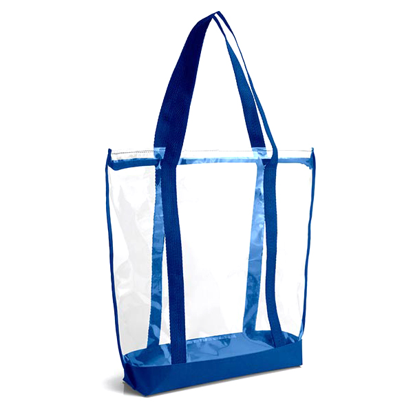Sacola transparente confeccionada em PVC / Nylon 600 com detalhes em azul, possui acabamento reforçado em costura lateral. Conta com estrutura dobrável e duas alças de mão com detalhe que se estende até a base do produto. Disponível em várias cores.